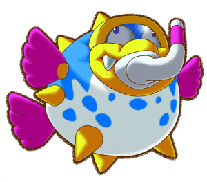 • Fugush is derived from 'fugu' (フグ) and gush; as in liquid flowing out in a rapid and plentiful stream like how Fugush creates water currents that may push the player near sea urchins. Fugu is a Japanese term for a number of fish that include pufferfish. Fugush looks more like a porcupinefish than a pufferfish as he has clearly visible external needles from its body. It is capable of ejecting the needles and puffing up new ones.