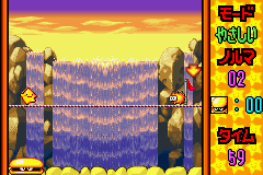 Move the d-pad left and right to move Moe across the rocks underneath Starfy. Press and hold the B button while moving to move faster. The A button can be used to fire foam at Starfy to cause him to make two steps towards the goal, or to defeat various Monjamin (green) and Hirapa (orange) like enemies which fall from the sky and attempt to walk on the tightrope with Starfy. If Starfy makes contact with one of these enemies, it causes the player to fail the minigame and they will be returned to the minigame selection menu. The orange enemies appear less often, but travel faster than the green enemies.