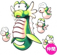 Tatsunomama is a female mother seahorse who acts as an ally to Starfy. Her children are known as the Tatsunoko. Tatsunomama allows the player play Seahorse Child Catch. She leads the player to a room with moving spikes and a Kagibanrei to help Starfy complete the Picture Book if he meets her after beating the game and clears her minigame on hard. Tatsunomama's children closly ressemble the Tatsubo.