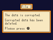 | 17:15, 30 November 2013 | TLS Data Corrupted.png (file) | 3 KB | The error screen that appears in ''The Legendary Starfy'' for when the save data for File 1 is corrupted. | 1 | |