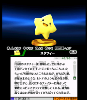 | 16:24, 3 October 2014 | SSB3DS Starfy trophy EU.png (file) | 60 KB | Starfy's ssbwiki:trophy description from a European English version of ''Super Smash Bros. for Nintendo 3DS''. Screenshotted by user:Torchickens. | 1 | |